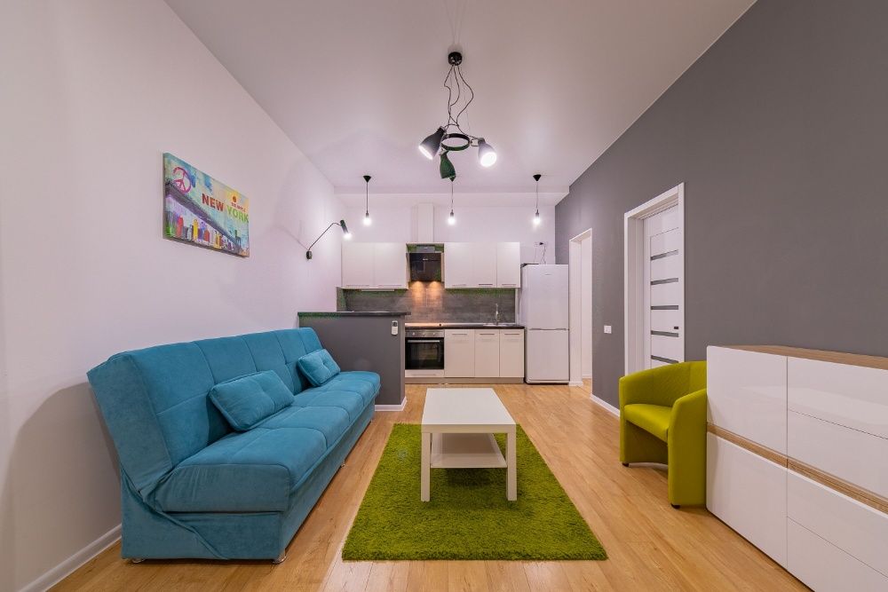 В гостиной-студии имеется бирюзовый диван, который раскладывается в двуспальную кровать. Яркий коврик цвета выгоревшей травы отлично сочетается с двумя креслами. Посередине комнаты установлен журнальный столик, у стены – комод. За комфортный микроклимат в помещении отвечает кондиционер. Сквозь панорамное окно открывается превосходный вид на столицу.